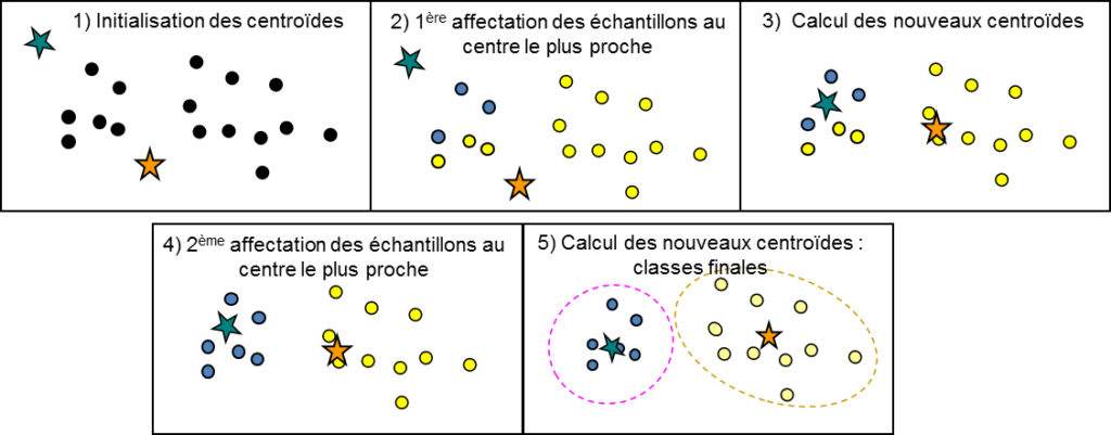 Puis, à chaque itération, le barycentre de chacune des classes est recalculé et les échantillons sont réaffectés au centre le plus proche.