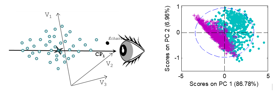 L’ACP peut être considérée comme un changement d’axes, conçus pour mieux visualiser la variabilité des échantillons, tout en maintenant les distances et les échelles entre les échantillons. Pour simplifier la visualisation, les échantillons sont habituellement observés sur un plan 2D ou 3D, correspondant à la projection des échantillons sur un ensemble de 2 ou 3 axes.